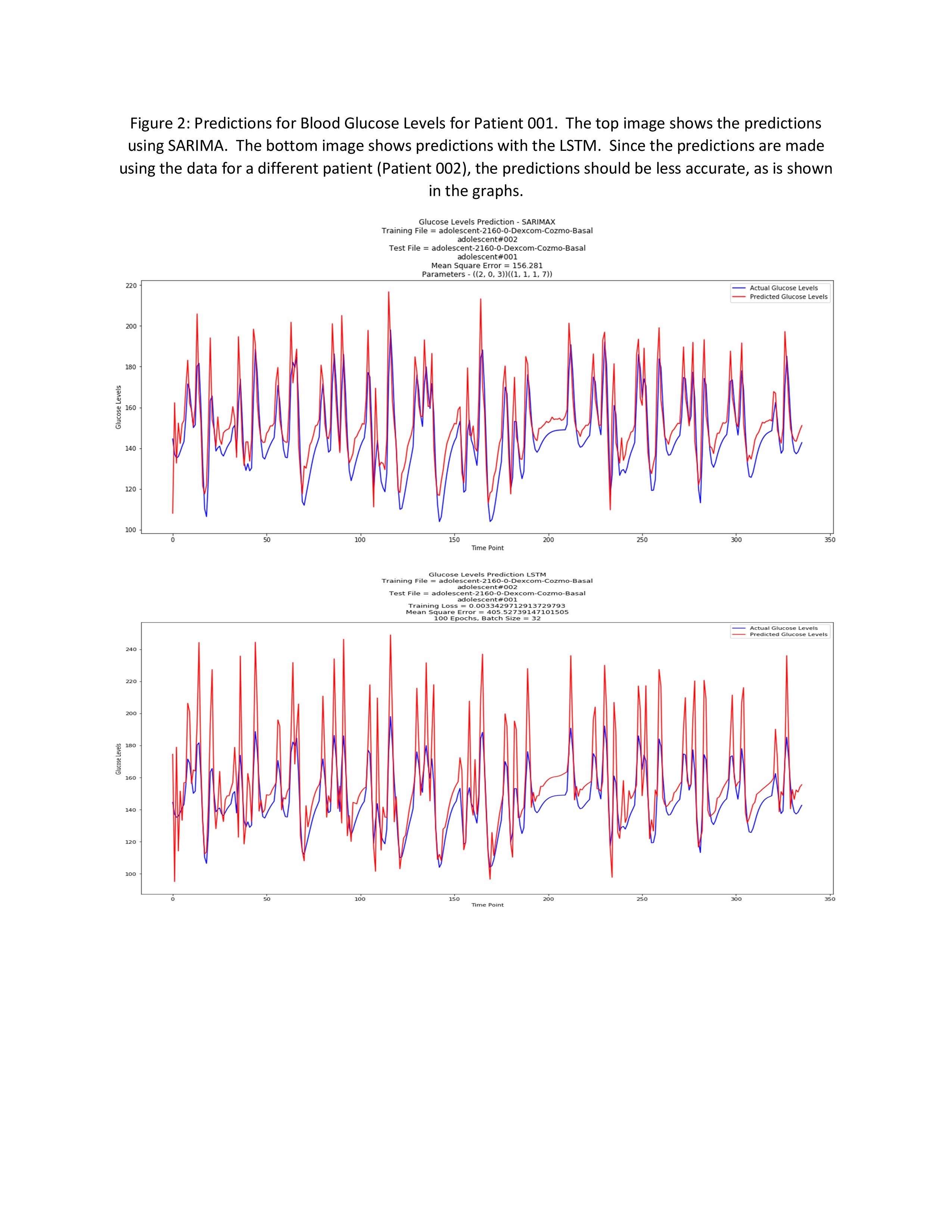 For training and predictions, I used synthetic data for adolescents that I termed as Patients 001, 002, 003, 004, and 005. For each patient, the 2,160 hourly training data points and 336 prediction data points were generated. I then did pairwise comparisons of all patients. For example, I would train a model using the training data for patient 001. I would then use that model to make predictions for patients 001, 002, 003, 004, and 005. The process was repeated for all patients. This gave a total of 25 comparisons. Full pairwise comparisons were performed to evaluate if either SARIMA or LSTM could create models that could be generalized to other patients.