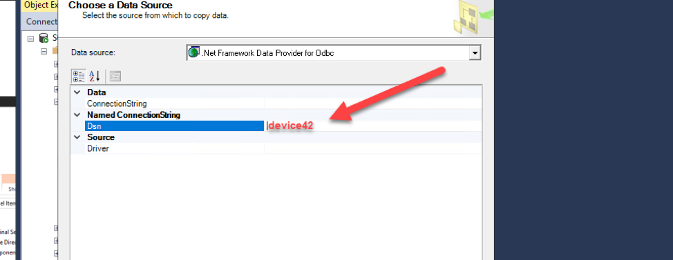 - Use device42 (name of the System DSN) as the connection name