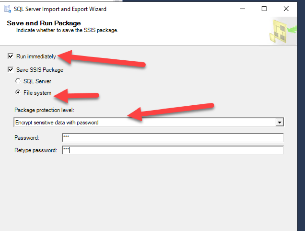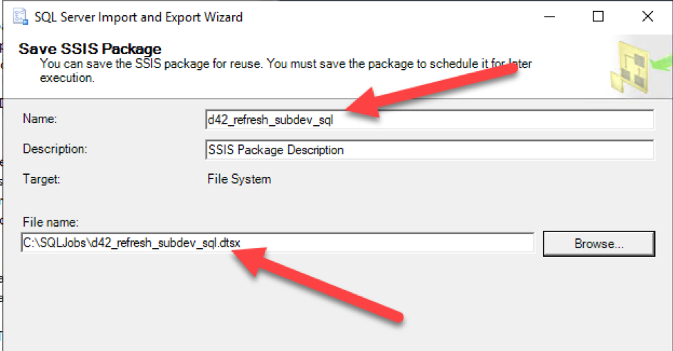 - Give it a good name and save location so it can be ran by the SQL Server Agent account