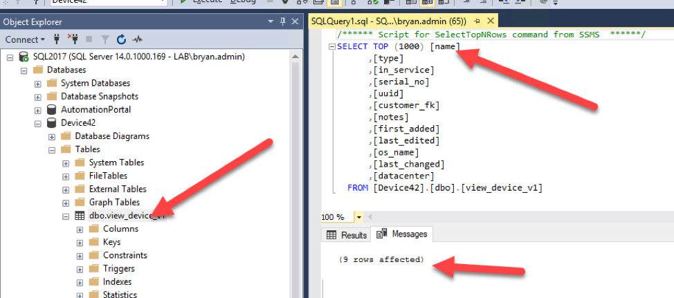 - “select name from view_device_v1 where in_service = 1” will return only in service device names
