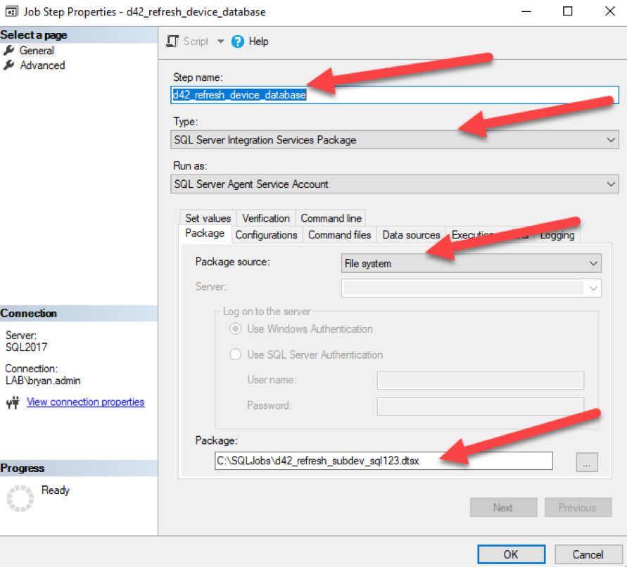 - For the new step Select the SQL Server Integration Services Package Type
