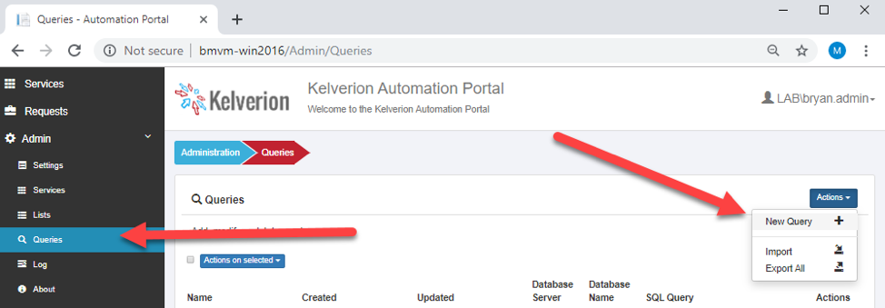- In the Kelverion Automation Portal Select Queries and New Query